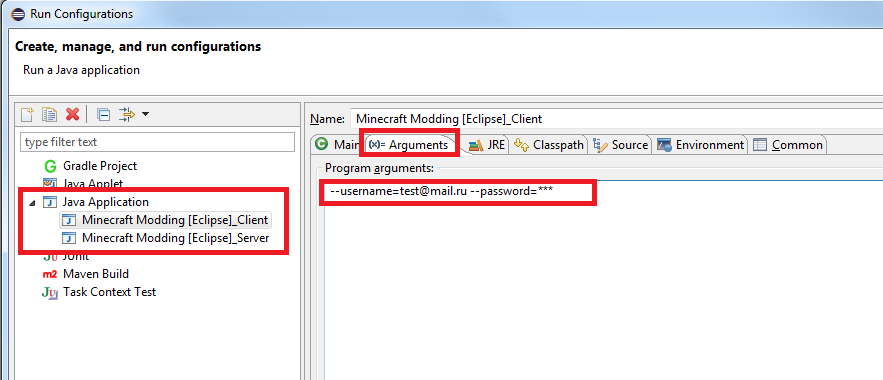 Отройте меню "Run" и выберите пункт "Run Configurations...". В левой части появившегося окна откройте вкладку "Java Application". Выберите пункт "[название папки с файлами]_Client". В правой части окна откройте вкладку "Arguments" и в поле "Program arguments" вставьте строку: