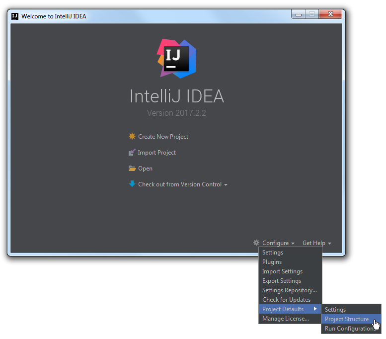 Решается проблема элементарно. Для начала, закройте окно импорта и вернитесь к стартовому окну IntelliJ и в правом нижнем углу нажмите на кнопку "Configure", откройте вкладку "Project Defaults" и выберите пункт "Project Structure".
