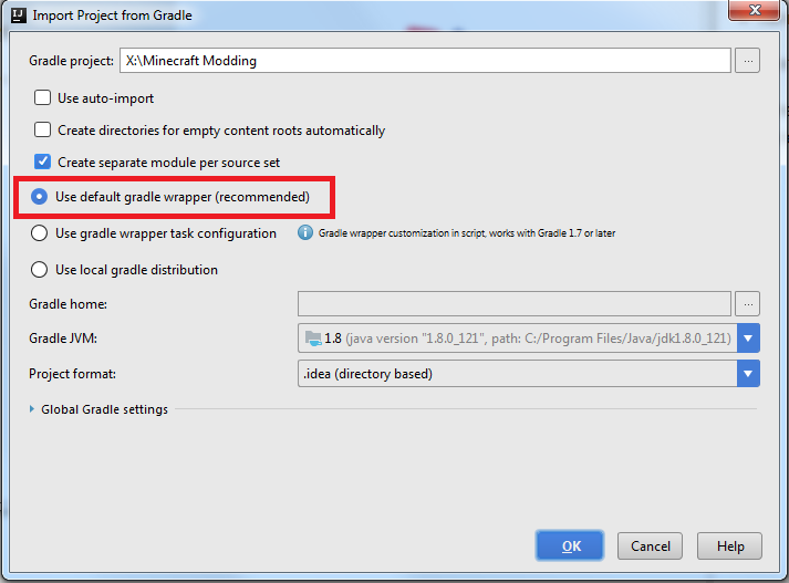 Убедитесь, что у вас выбран пункт "Use default gradle wrapper (recommended)". Все остальные настройки оставьте по умолчанию и нажмите ОК.