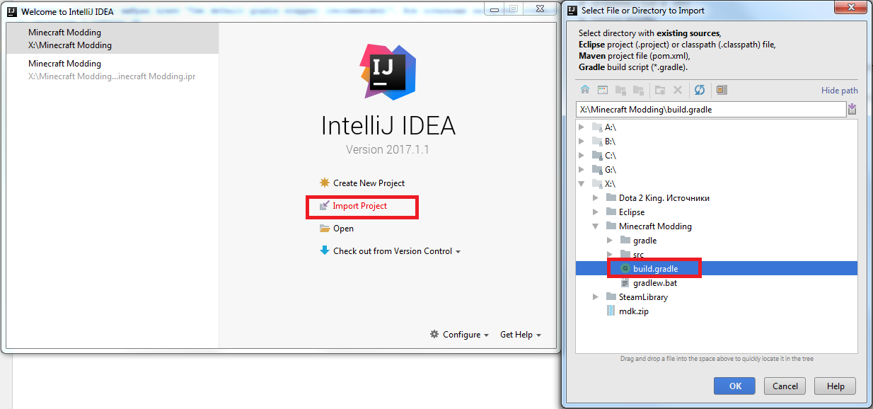 Запустите Idea и в стартовом окне кликните по кнопке "Import Project". Импортируйте файл "build.gradle".
