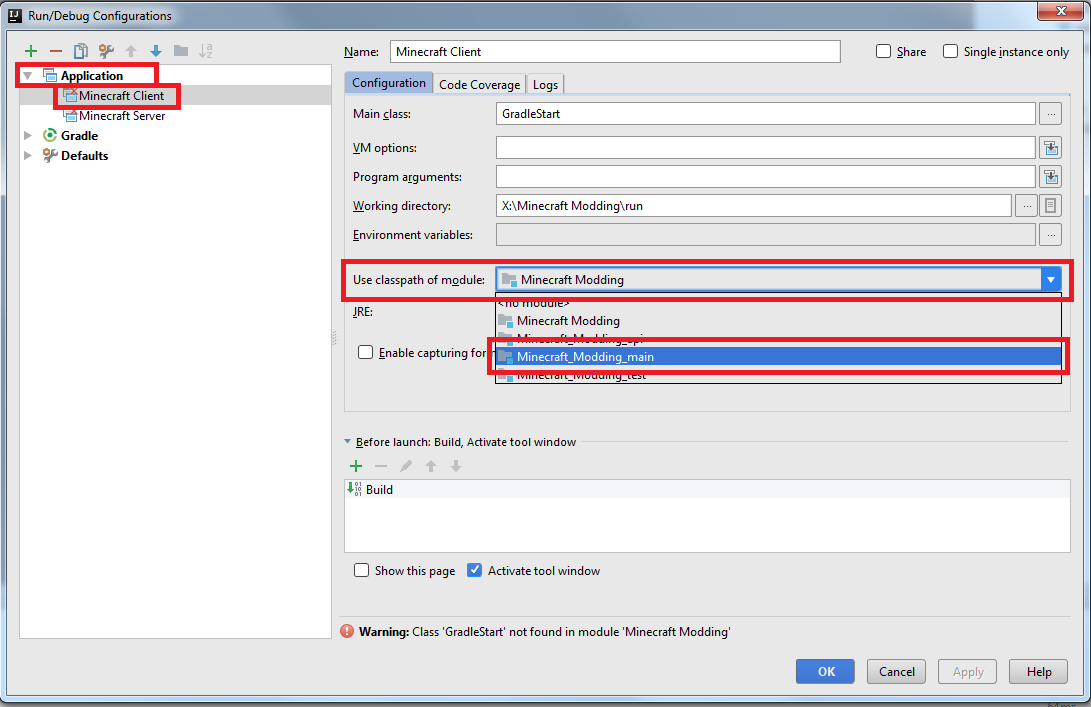В левой части появившегося окна откройте вкладку "Application". По очереди выберите "Minecraft Client" и в "Minecraft Server" и уже в правой части окна, в раскрывающемся списке "Use classpath of module" выберите тот пункт, который заканчивается на _main.