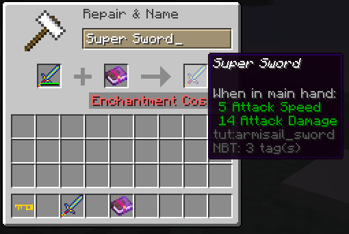 У нас вышел уровень инструмента, который имеет 4 уровень добычи, 2500 прочности, 7.2 эффективности, 5 урона и полностью чинится 5 зачарованными книгами. Давайте применим его: